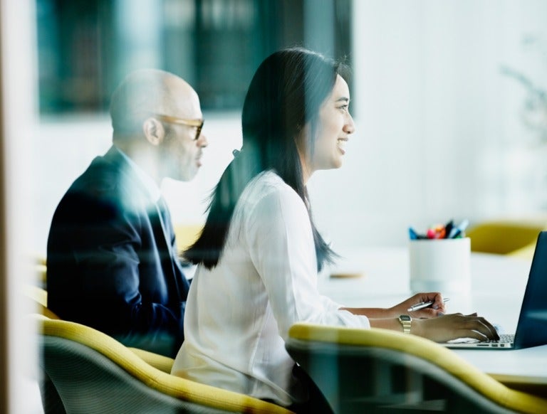 A man and woman at work in a glass conference room.