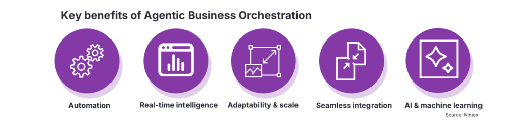 A. Agentic Business Orchestration automates and manages workflows across multiple systems and data sources. It helps organizations coordinate work, make faster decisions, and quickly adapt to change.