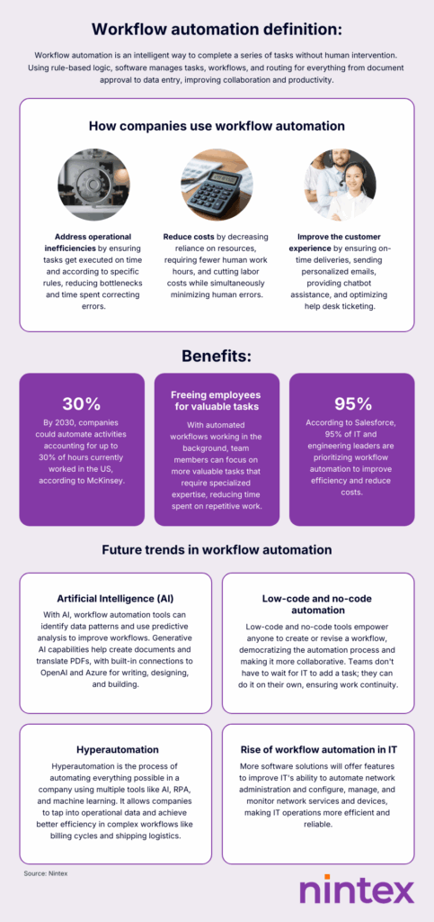 Workflow automation is changing the way people do business. By 2030, companies could automate activities accounting for up to 30% of hours currently worked in the US, according to McKinsey.